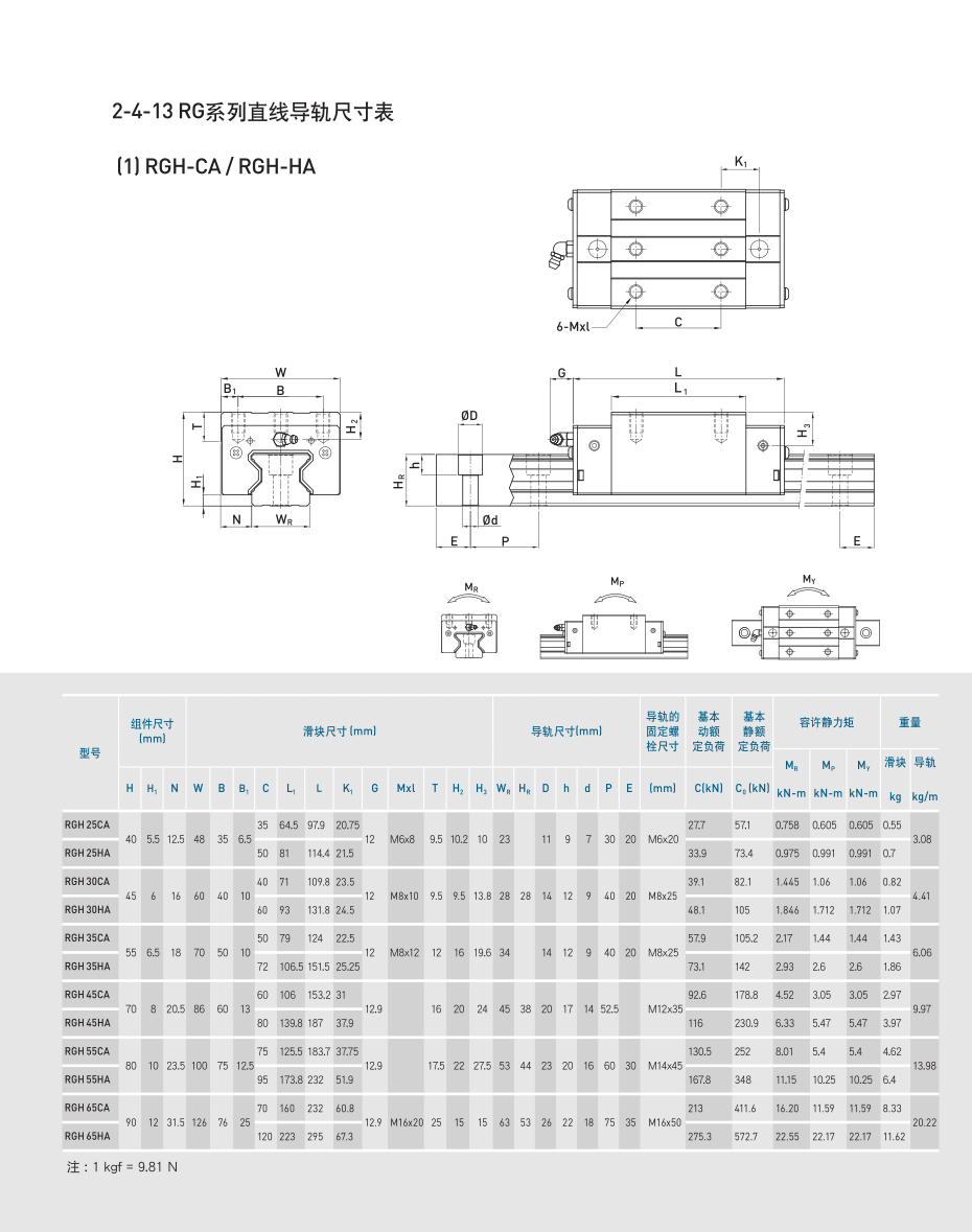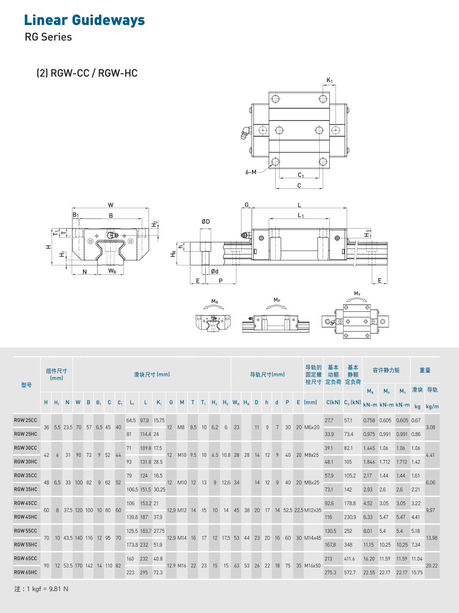 RG系列以滾柱型滾動體取代了鋼珠,為實現(xiàn)超高剛性與超重負荷能力而設(shè)計;透過滾動體與導軌與滑塊的線接觸方式,讓滾動體在承受高負荷時僅僅形成微量的彈性變形,更藉由45度的接觸角度的設(shè)計,讓整體直線導軌達到四方向等高剛性、等高負荷能力的特性表現(xiàn)。透過超高剛性的實現(xiàn),可大幅提升加工精度,達到高精度的訴求;由于超重負荷的特性,進而延長直線導軌的使用壽命。